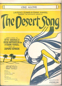 The Desert Song (with lyrics by Oscar Hammerstein) is your typical superhero-adopts-mild-mannered disguise-to-keep-his true-identity-secret saga much like Zorro and Superman but with better music and no phone booths. The Red Shadow loves a beautiful and spirited girl, who loves his hero persona but not his wimpy side.  Will true love win out over hero worship? After much sophisticated music, lust in the dust and naughty humor, we learn the answer, especially in a lavish 1929 film production of the operetta – but only until the 1940s when it became illegal to view or exhibit the 1929 film in the United States because the folks in charge feared the naughty bits would morally harm us.