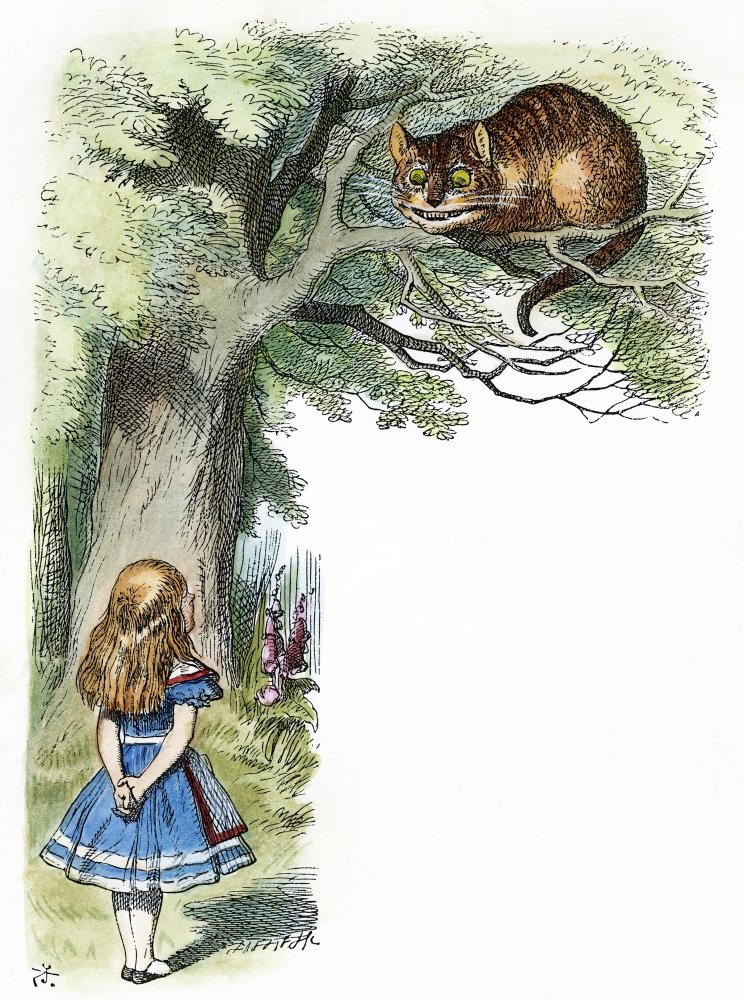 Alice stood at a crossroads, wondering which way she ought to go. As she pondered, she spotted a large Cat on the branch of a tree a few feet away, grinning at her. She had never known a Cat to grin before and didn’t even know a Cat could grin. It looked rather good-natured, but it had very long claws and a great many teeth so Alice thought it wise to treat the Cat with respect.