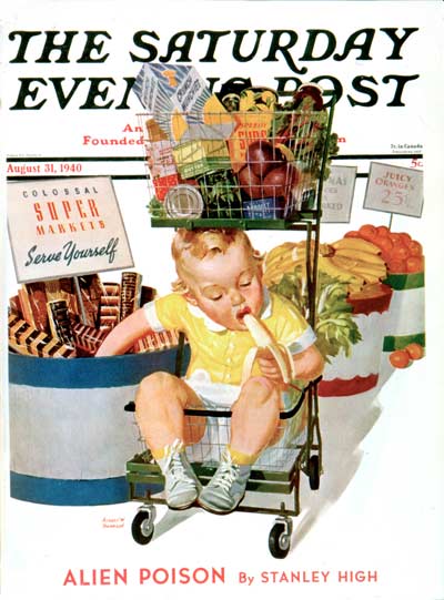 By the 1940s, the carts had become so much a part of the American shopping experience that the Saturday Evening Post devoted its cover to them. And they got bigger and bigger until they got tiny as little icons on websites everywhere.
