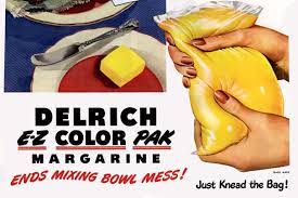 Margarine manufacturers used various tactics to bring color to their products. One of the oddest was a method devised by the W.E. Dennison Co. that used a capsule of yellow dye inside a plastic baggie of margarine The consumer would knead the package, breaking the capsule, allowing the dye to eventually spread throughout the margarine. Some consumers were still kneading their first lump of margarine when, in 1955, the ban on yellow margarine was lifted. Today margarine remains a glorious shade of yellow, and the naked eye cannot tell it from Real Butter. It does still taste like silly putty, however.