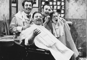 The musical style of barbershop dates back to 17th century England. Barbers of course all sing, and the barbers of merry olde were no exception. They generally kept a lute or a flute among the razors to serenade customers waiting for a shave and a haircut, two pence. Patrons, having just come from a nearby alehouse, would join in and the resulting cacophany became known as barber’s music. Centuries passed (as centuries will) and barber’s music grew more refined and subject to rules.