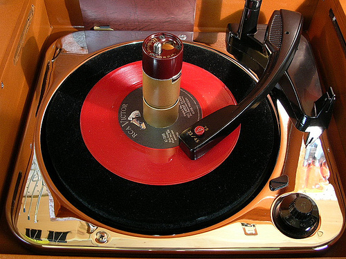 RCA Victor it might be said crossed the Rubicon when on January 10, 1949, it introduced a new kind of record — a vinyl disc, just seven inches in diameter with a great big hole in the middle, the 45 (referring to its revolutions per minute). The 45 replaced the big noisy shellac disc that rotated at a breakneck 78 rpm. The first 45 rpm single was “Peewee the Piccolo.” Remember it?